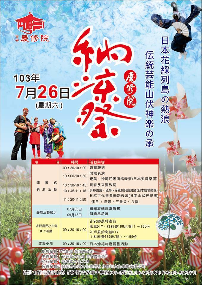 炎炎夏日即將進入尾聲,涼爽的秋季即將到來,花蓮縣吉安慶修院也比照日本的夏日祭典習俗辦理「納涼祭」活動、歡迎闔家蒞臨吉安慶修院、體驗一場日本傳統文化祭典活動。當天有日本東北地方的山伏神樂,沖繩的三線樂團的表演。