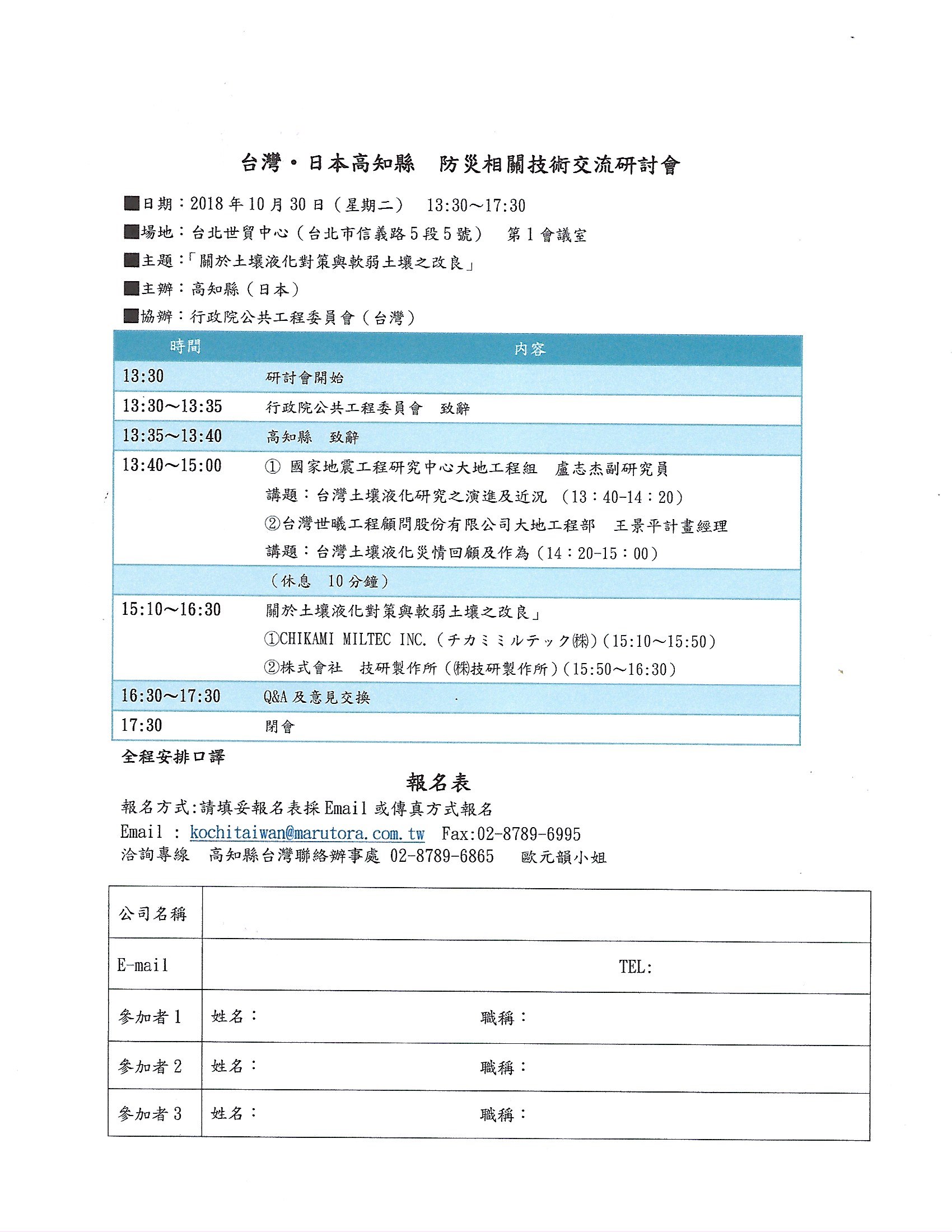 【高知県】台灣・日本高知縣 防災相關技術交流研討會 (主題:關於土壤液化對策與軟弱土壤之改良)
