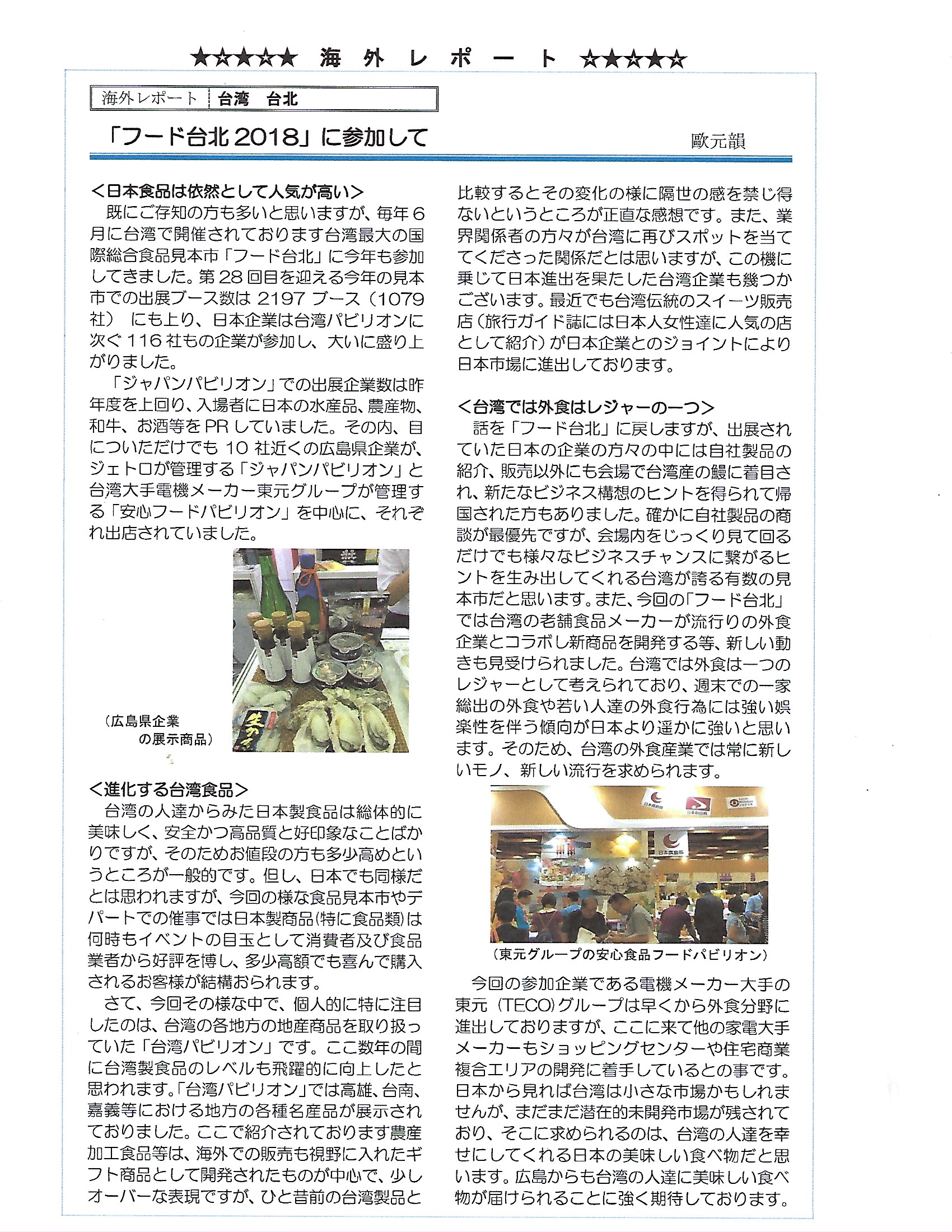 【広島産業振興機構 ハッピーメール】2018年9月号 (テーマ:フード台北2018に参加して)
