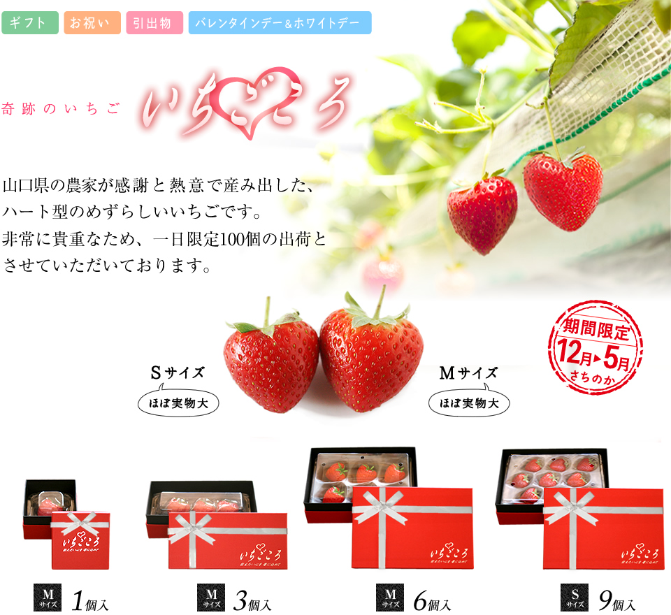 產品特色:日本國內第一個種植出愛心形狀的草莓。為了保有藤弘農園草莓原有的美味,克服重重困難,歷經四年,終於創造出日本國內第一個愛心草莓。由於心型草莓非常稀有,因此每日僅限定販售100顆。